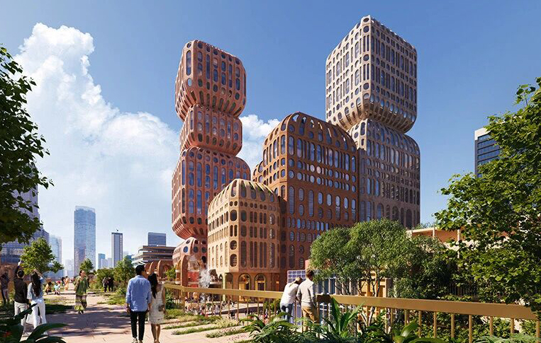 地面层打造5200㎡“公共村庄”:修复历史运河、遮阳广场、本土绿植与露天市集交织,融合神社、儿童区等社区功能,营造可漫步、可休憩的“开放式村落”。